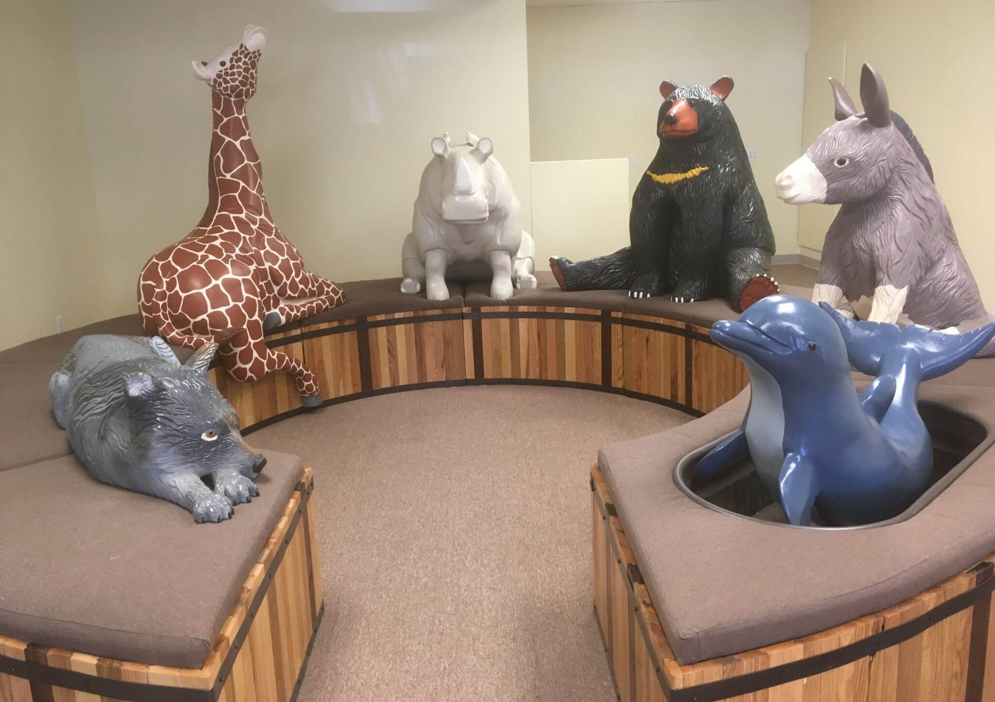 “I have to share some joy of using the Council of Kindness this morning as an alternative setting for my counseling practice. I invited a client with a long trauma history to meet with the animals. My intent was to provide some “Resourcing” against her sensations of trauma. She came into the room and found a giraffe, leaned up against her, looking up at her wonderful face. She stroked it and sat for about 3 minutes (while listening to some bilaterally mastered music specifically created for settling the nervous system). I checked in after this brief time not wanting to go too long if she was feeling unsafe. She looked at me with the softest expression and very calmly said, ‘I feel surrounded and full of love.’ To help her relearn this sensation of safety and a moment of peace will be a gift to her treatment. May the wonderful magic of your creatures continue to heal. Just had to share.“